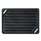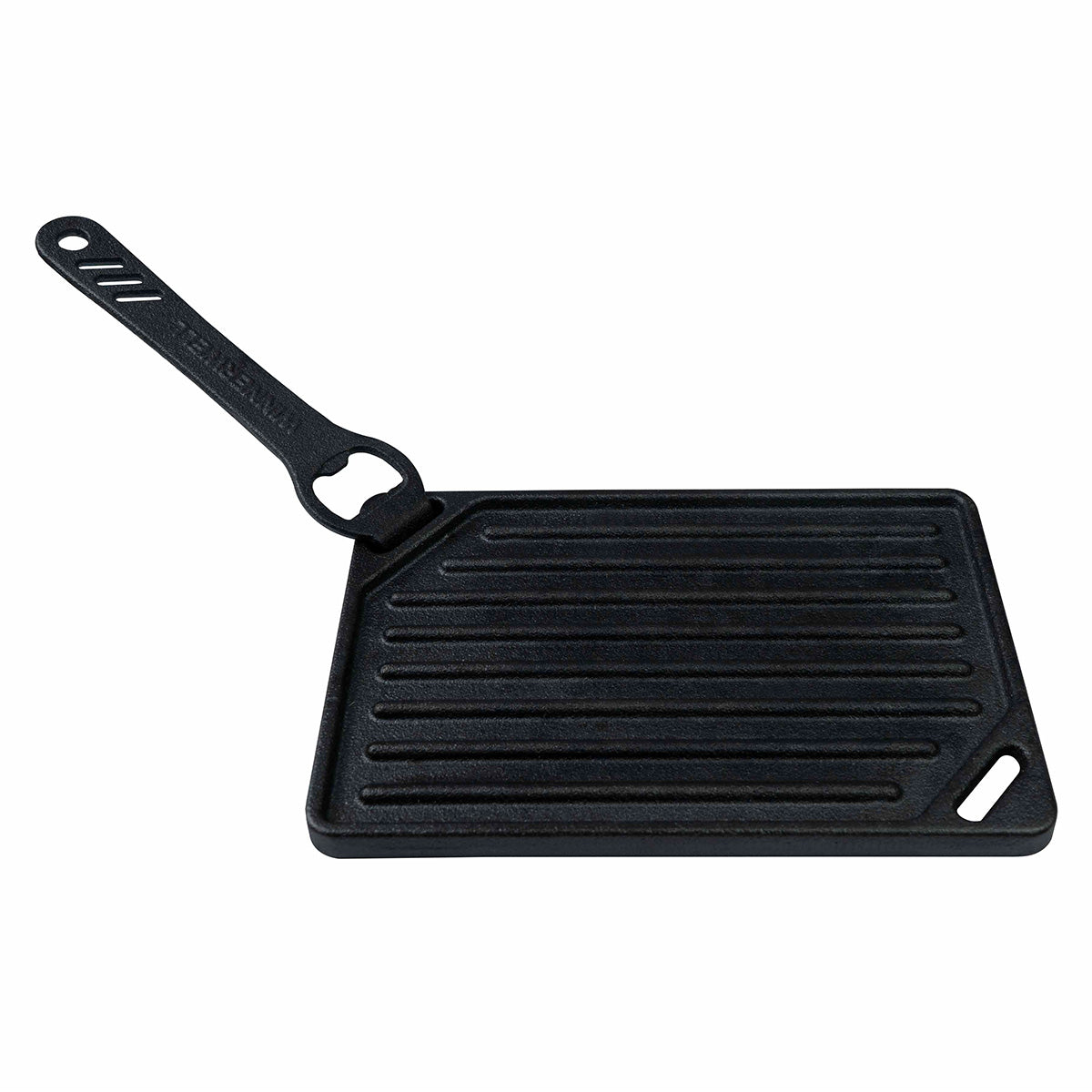 Its double-sided design allows you to sear on the ribbed side or use the smooth side for other cooking. The cast iron construction retains heat evenly for consistent cooking. The included Iron Handle allows you to safely lift and transport the hot grill plate and doubles as a bottle opener for convenient refreshment.