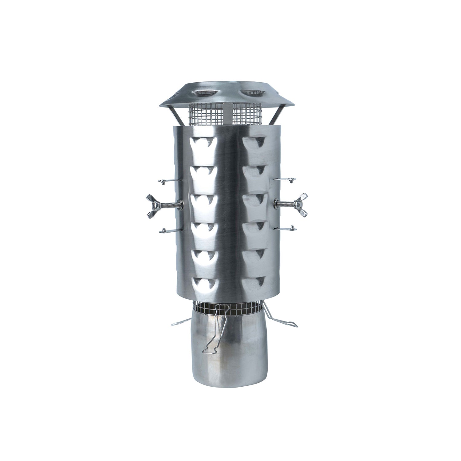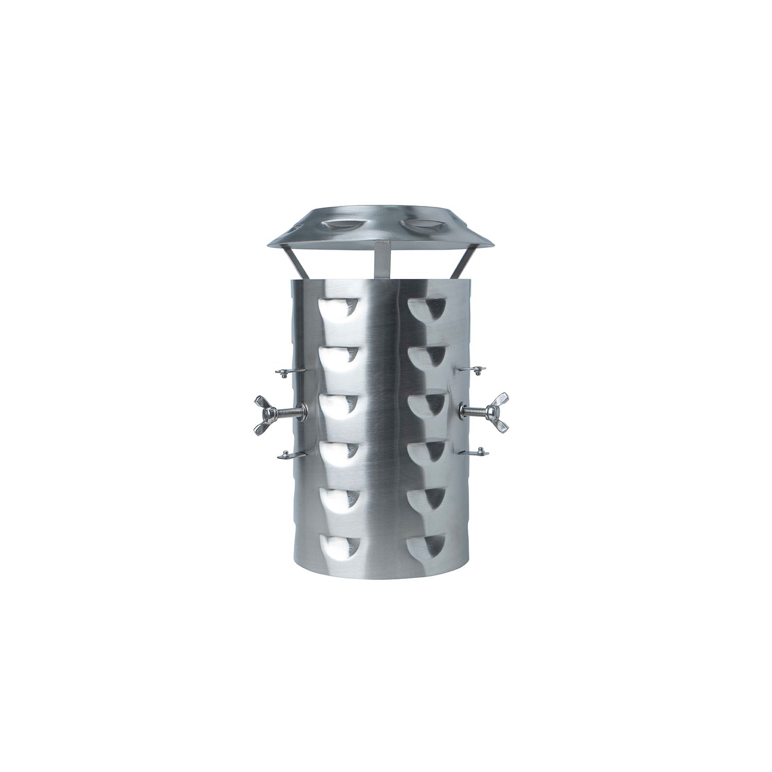A useful accessory for any Winnerwell Stove user, the Spark Arrestor Rain Cover is compatible with all sizes of Winnerwell Spark Arrestors (small, medium, large) and quickly attaches with integrated wing nuts. Ventilation slots allow smoke to escape while preventing rain from entering the flue pipe.