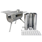 The Winnerwell Woodlander Double View - Large provides a captivating fire view with two large windows that run the length of the firebox. It’s all the utility of the standard Woodlander with a little extra luxury. It is deep enough to accept standard size split firewood and the 3 spring-loaded legs fold flat for transport and quickly deploy for stability on uneven surfaces. The durable 304 stainless steel construction performs in harsh outdoor environments. An ideal stove for use in compatible hot tents and for outdoor cooking utility.
