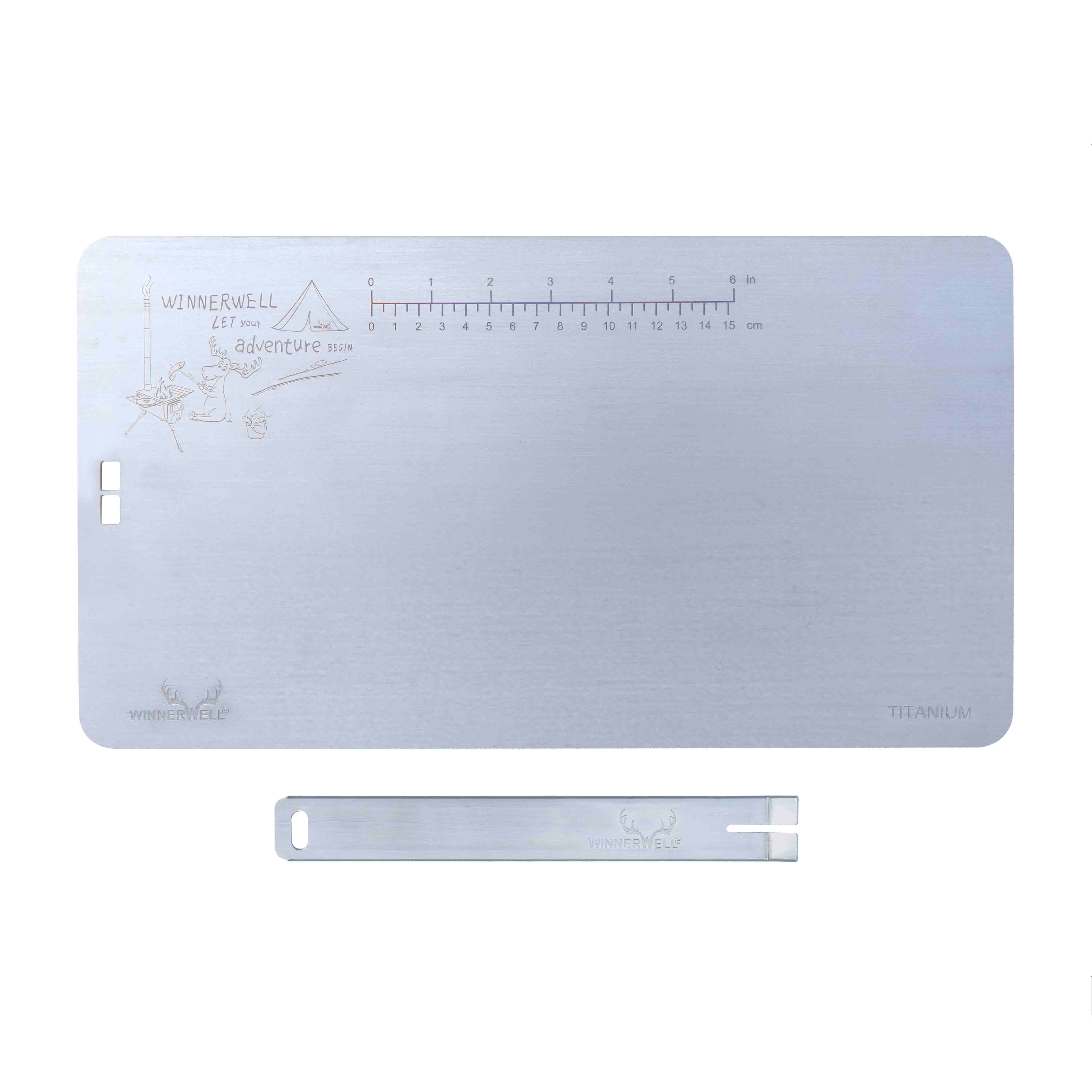 Multifunctional titanium cutting board can also be used as a baking tray, thawing tray, or as grill plate to be used on top of: Winnerwell® Stainless Stoves, Fastfold Titanium stoves, backpack stoves, Flatfold Fire Pits.