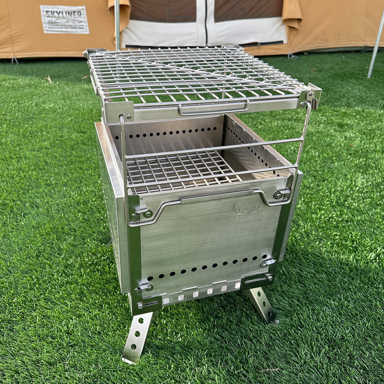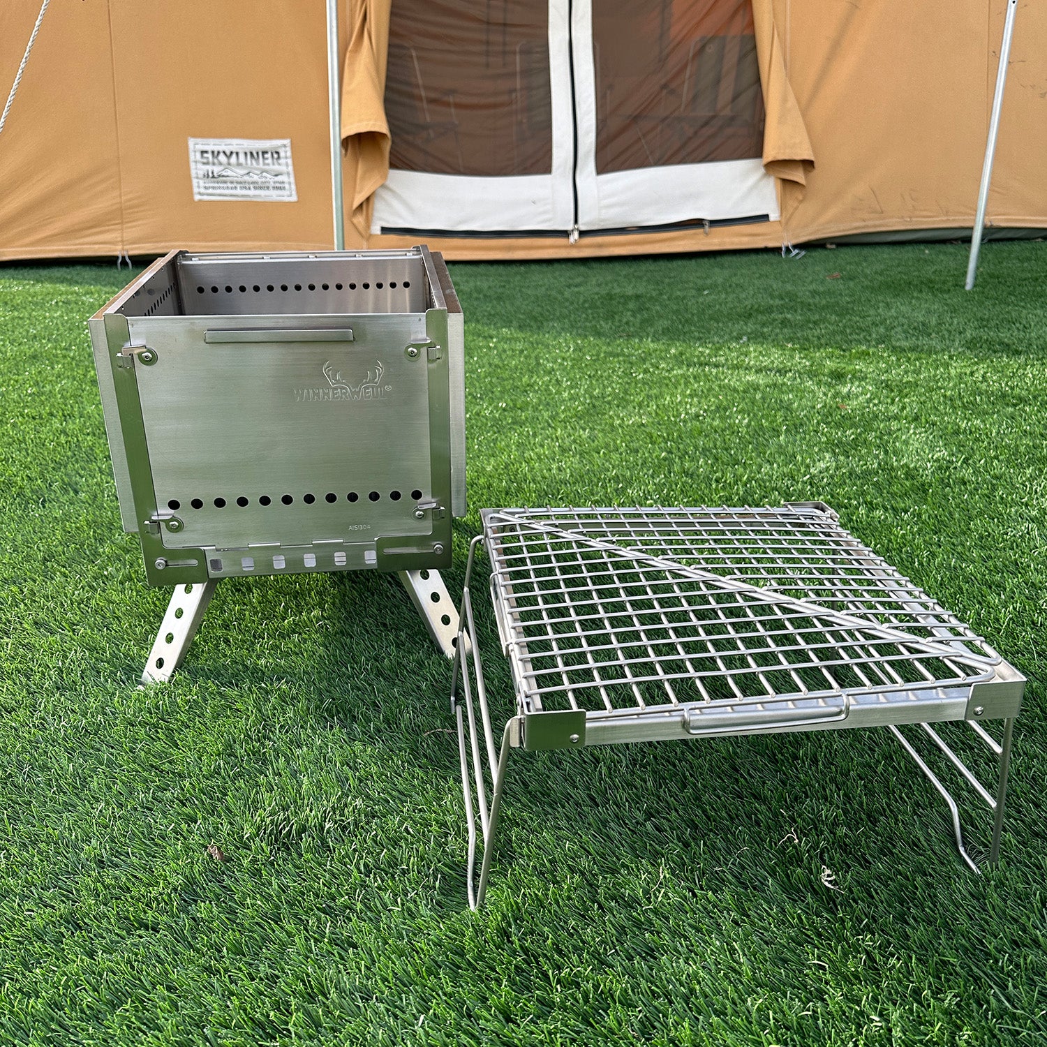 Transform your fire pit into a versatile grill with the included grill accessory to enjoy all your cooked meats veggies and more over the open flames. The grill can also become a self-standing table/shelf, or used separately to accommodate your camping needs. Look no further for your new, go-to high performing portable fire pit and grill to enjoy all season on all your adventures.