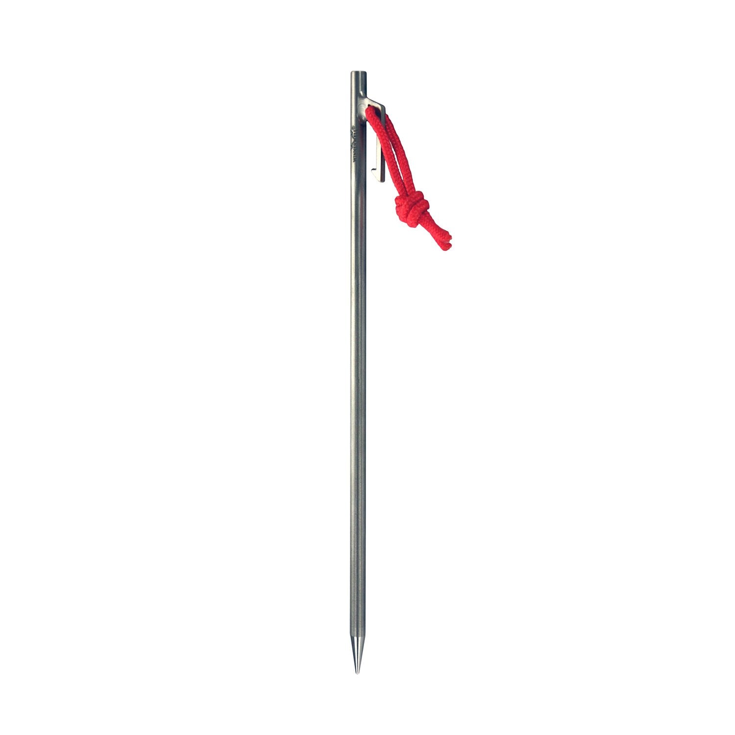 At just 2.4 ounces and nearly 12-inches long, the Winnerwell Titanium Tent Stake is exceptionally light and incredibly strong. The angled hook at the head of the stake pairs nicely with the wire stake loops found on Springbar Tents. A good choice for hard and rocky soil and keeping pack weight to a minimum.